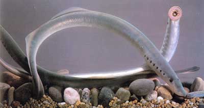 七鳃鳗外形与蛇、黄鳝相似,头的两侧在眼睛后面各有一行7个分离的鳃孔,鳃孔与眼睛排成一直行,故俗称八目鳗。头前腹面有陷入呈漏斗状的吸盘,张开时呈圆形,周围边缘的皱皮上有许多细软的乳状突起。口在漏斗的底部,口的两侧有许多黄色角质齿,口内有肉质呈活塞形的舌,舌上有角质齿。