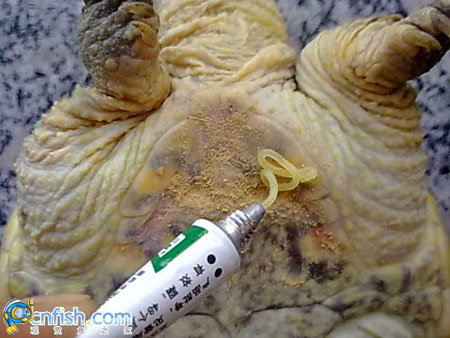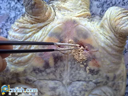 上完药等干了,别沾水,几个小时后放鱼缸里,每天换药一次,愈合为止。
