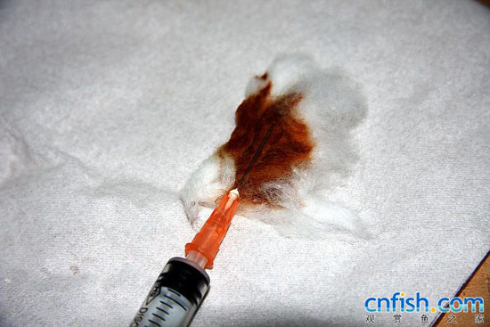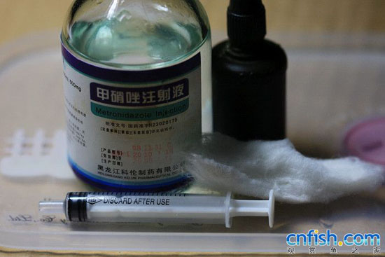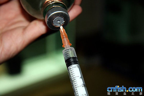 1、用碘酒先把针头消毒 2、抽取0.5毫升药液(鱼的体重150克)