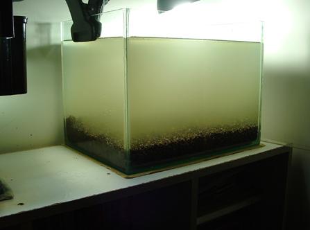大概泡了4天,每一天的工作就是吧把土洗一遍,放水再泡,沉浸在盆里的仙土是不怎么黄水的,估计是没有外力的干扰。看着水并不是太黄,所以赶紧下缸了。订做了个40×30×30的小缸,放水时注意一定要加个盘子,因为仙土的比重还是比较小的,所以比较容易被水流冲翻,造成水体浑浊。上面的图是刚加完水的状态,成白色混浊状