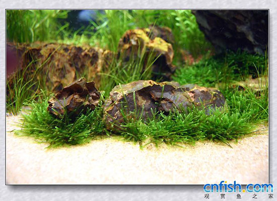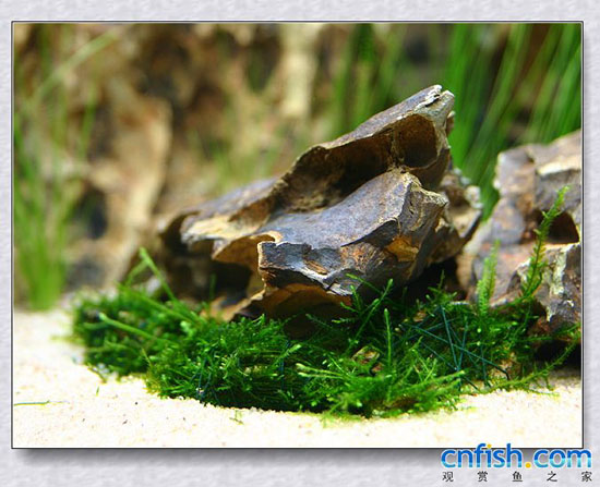 水草造景中经常可以使用到石材 石材运用的好坏 直接影响到造景效果 本贴给大家介绍一种采用moss点缀处理石材的手法:根据不同的留白大小以及石材的形状 石材与底砂之间可以采用moss进行自然地过渡 只需要用不锈钢丝网剪切成需要的形状 帮上moss 把moss板插在石材与底砂之间的缝隙里 这样随着moss生长 会给石材和底砂带来一个很自然的过渡效果 呵呵 运用好了能够起到画龙点睛的效果。。。