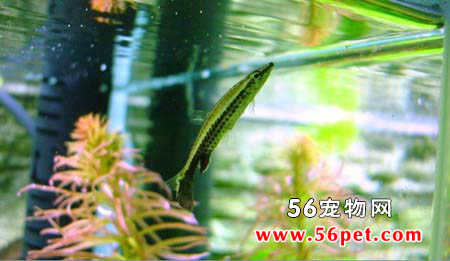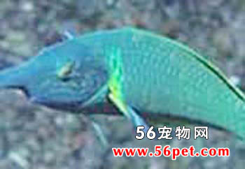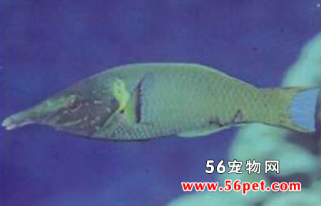 分布于印度洋、太平洋的珊瑚礁海域,隆头鱼科。体长25-30cm,嘴呈管状往前突出,体灰绿色,鳃盖后方胸鳍处有一条白色短带,尾鳍蓝色。鱼体在幼鱼期和成年期体色不断变化。饲养水温27-28摄氏度,海水比重1.002-1.023,海水ph值8.0-8.5,海水硬度7-9度dh。饵料有冰冻鱼肉、水蚯蚓、红虫、海水鱼颗粒饲料等。