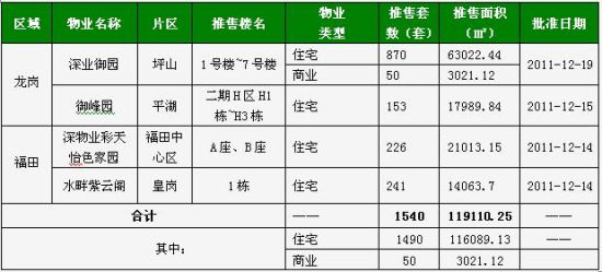 备注:1)数据来源于深圳市规划和国土资源委员会网站销售公示; 2)由于国土局网站更新延迟,御峰园、深物业彩天怡色家园、水畔紫云阁暂列为本周新增预售项目。